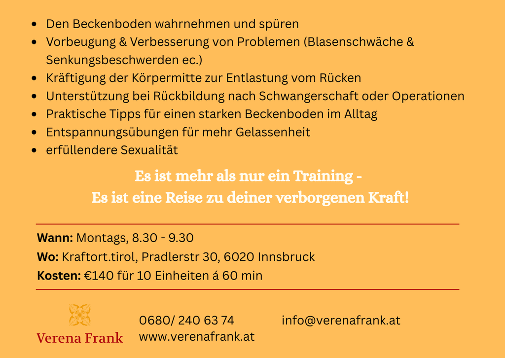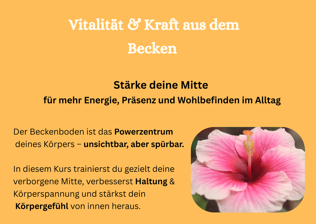 In diesem Workshop werden wir den Beckenboden mit bewussten Wahrnehmungsübungen erspüren und lernen, ihn präzise zu aktivieren und mit der Atmung zu kombinieren. Mit sanften Übungen werden wir unsere Körpermitte und die tiefe Rumpfmuskulatur stärken.
