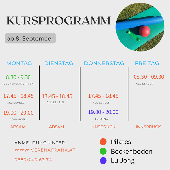 Derzeit biete ich Lu Jong, Pilates und Beckenboden Kurse in Innsbruck und Absam in Kleingruppen bis max. 10 Teilnehmer